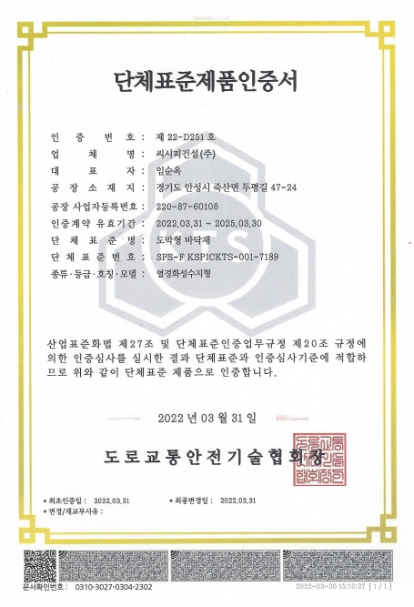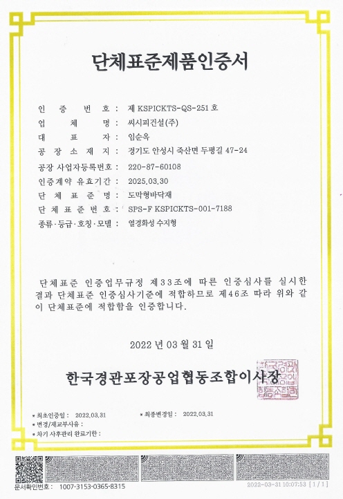 도막형바닥재 단체표준제품인증서 페이지 정보 작성자 씨시피건설 댓글 0건 조회 3,537회 작성일 22-11-30 10:59 목록 본문 도막형바닥재 단체표준제품인증서 이전글도막형바닥재 환경표지인증서 22.11.30 다음글학교 농구장 및 트랙 흙콘크리트 시공 사례 21.06.08 댓글 0 댓글목록 등록된 댓글이 없습니다.
